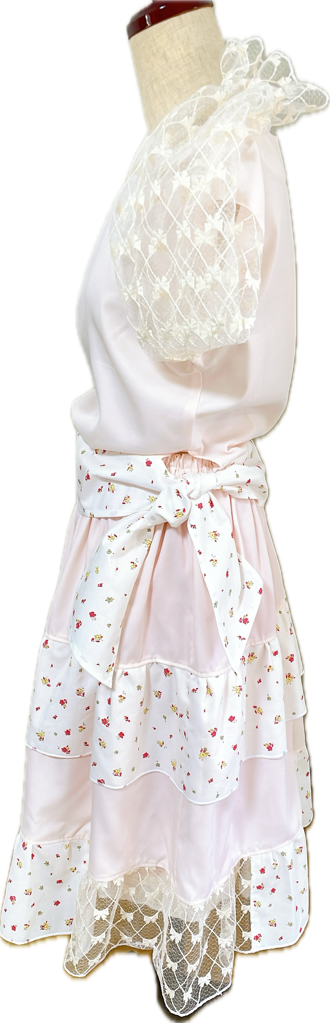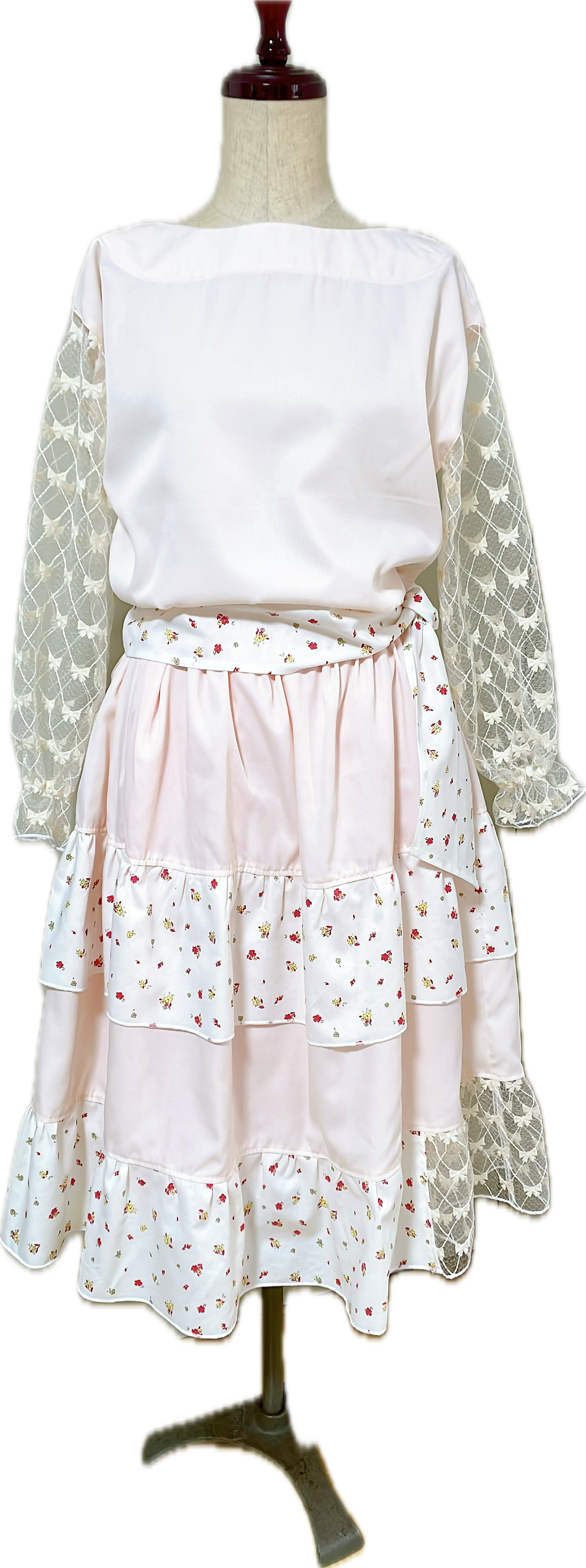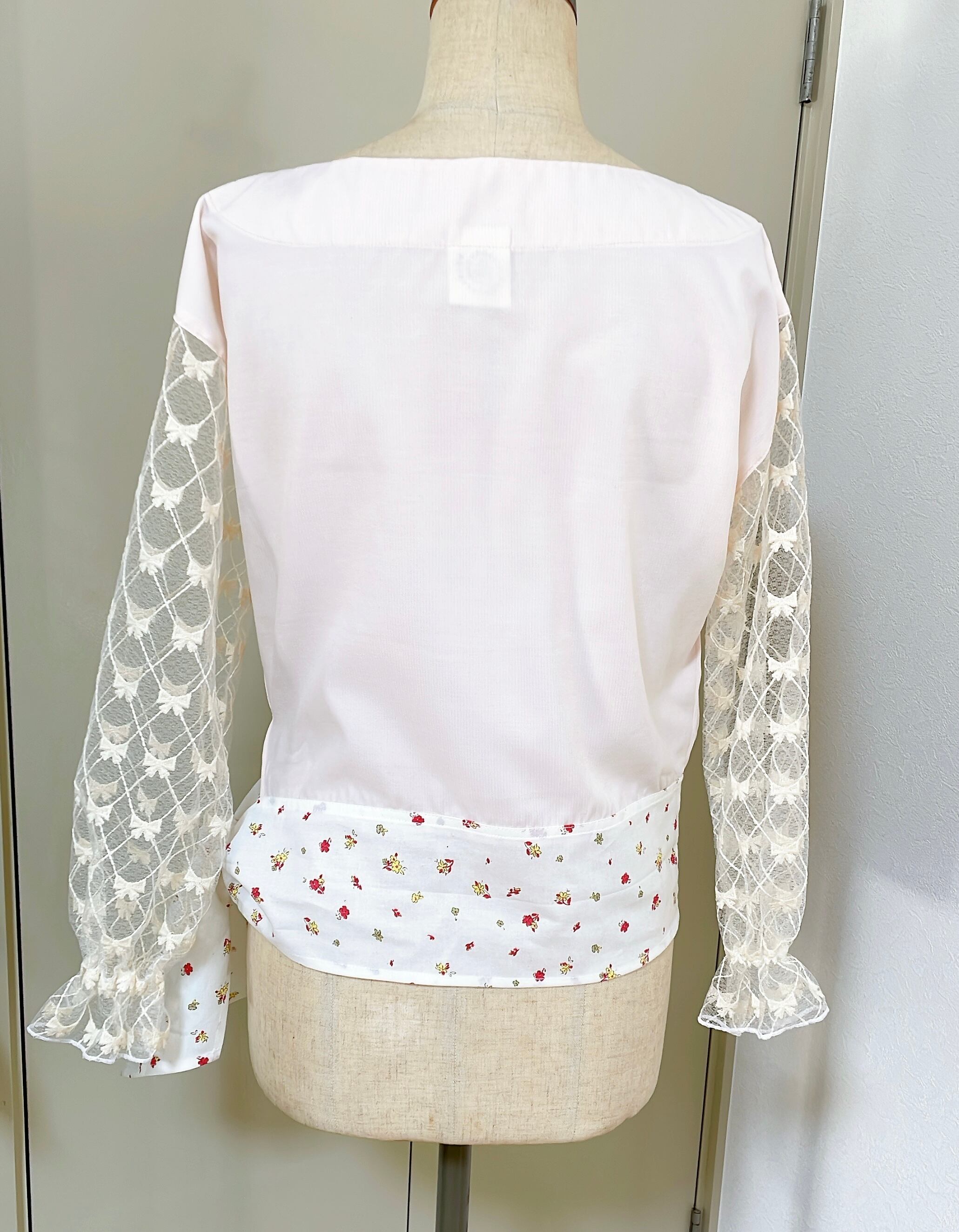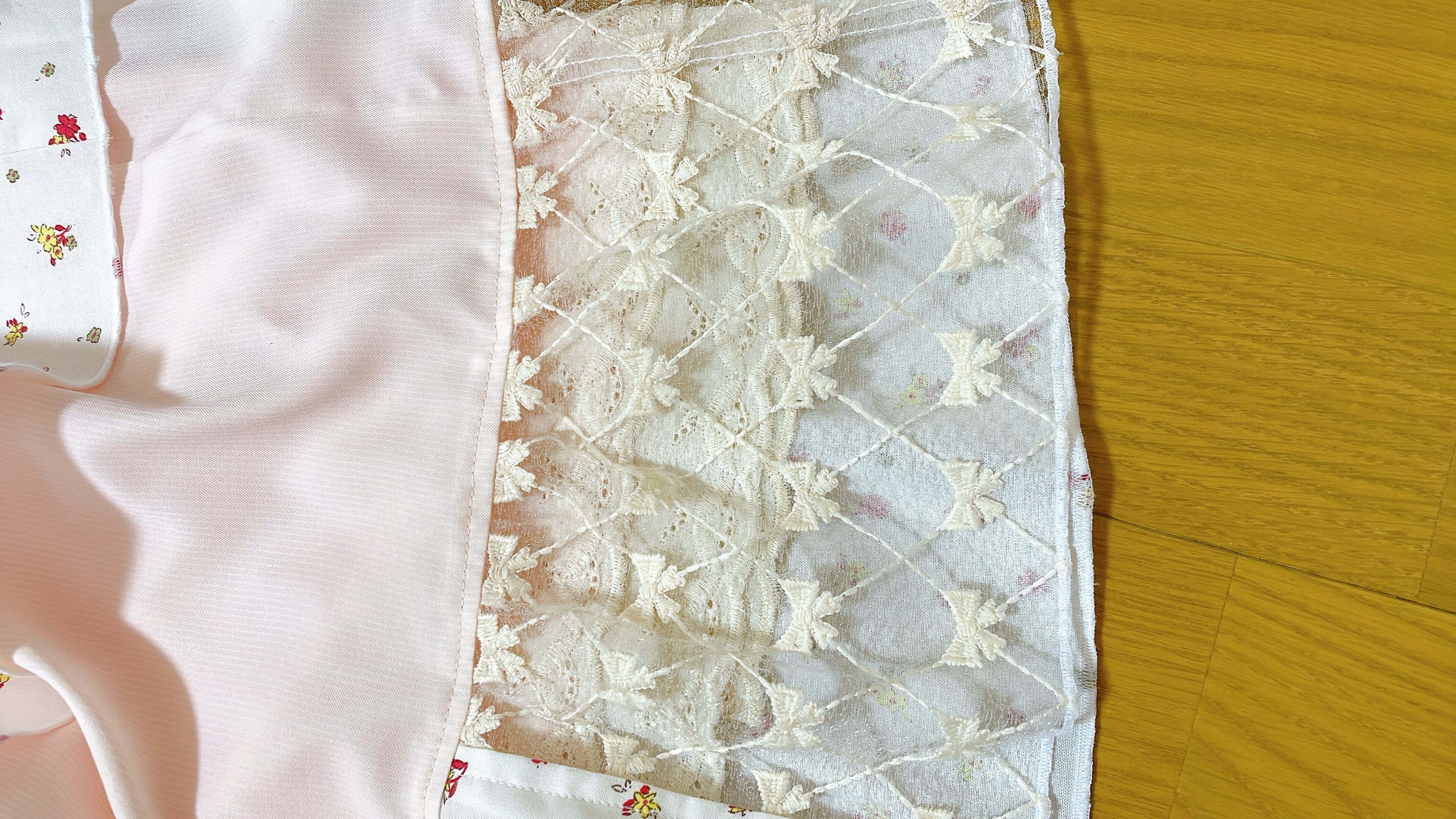 ベース生地は軽やかで透け感があります。花柄生地はレトロなコットン生地です。それはリボン柄の刺繍レースです。